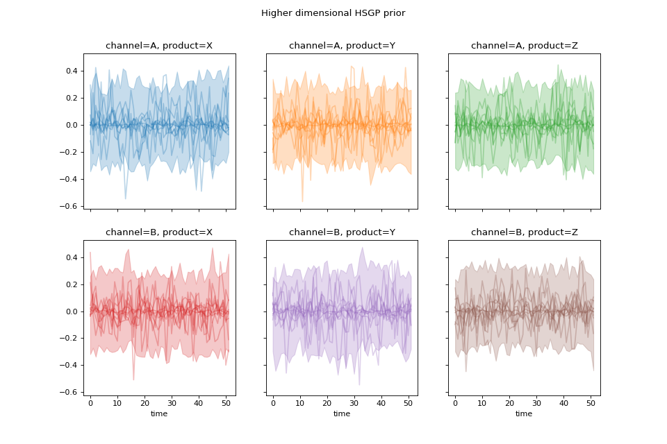 import numpy as np import pymc as pm import matplotlib.pyplot as plt from pymc_marketing.mmm import HSGP seed = sum(map(ord, "Higher dimensional HSGP")) rng = np.random.default_rng(seed) n = 52 X = np.arange(n) hsgp = HSGP.parameterize_from_data( X=X, dims=("time", "channel", "product"), ) coords = { "time": range(n), "channel": ["A", "B"], "product": ["X", "Y", "Z"], } prior = hsgp.sample_prior(coords=coords, random_seed=rng) curve = prior["f"] fig, _ = hsgp.plot_curve( curve, random_seed=rng, subplot_kwargs={"figsize": (12, 8), "ncols": 3}, ) fig.suptitle("Higher dimensional HSGP prior") plt.show()