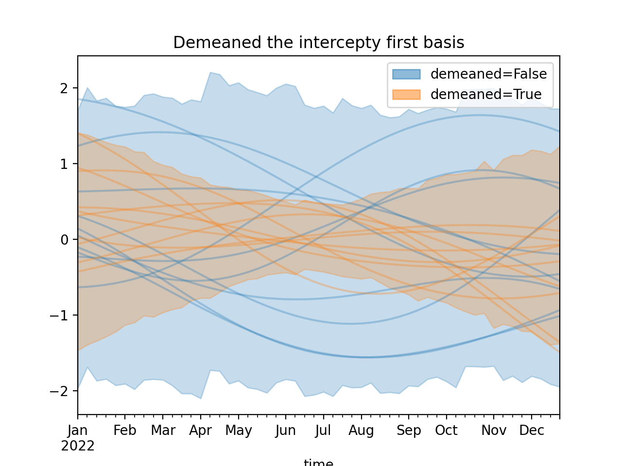)Using a demeaned basis to remove “intercept” effect of first basis: